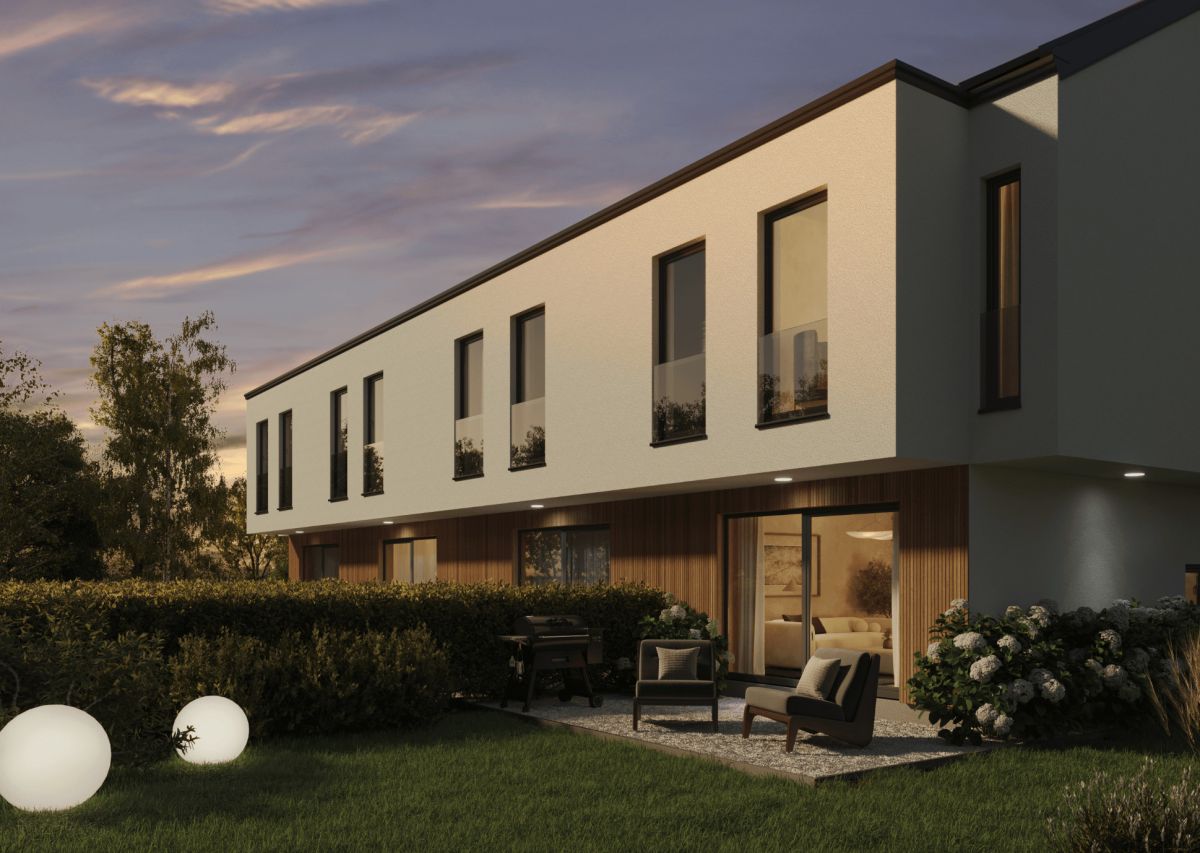 Budynek wyróżnia się estetyczną formą - jasne elewacje przełamane naturalnym drewnem nadają mu nowoczesny, ciepły charakter. To idealna propozycja dla osób szukających funkcjonalnego i harmonijnie zaprojektowanego domu.