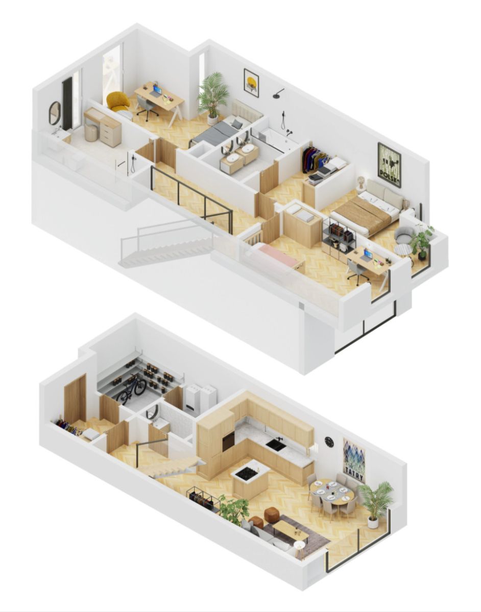 Na piętrze znajdują się wyłącznie pełnowysokościowe pokoje, oferujące swobodę aranżacji. Szczególną uwagę poświęcono strefie rodziców - Master Bedroom z prywatną garderobą i elegancką łazienką wyposażoną w wannę. Duże, starannie dobrane okna zapewniają doskonałe doświetlenie wszystkich pomieszczeń.